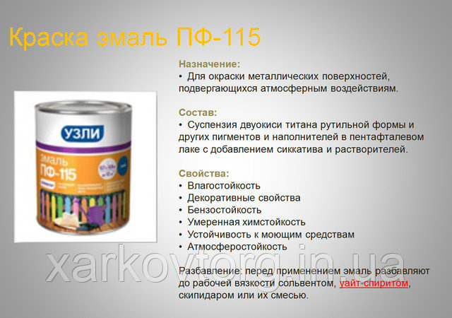 Эмаль ПФ 115 технические характеристики которой не уступают брендовым краскам от лучших производителей мира, обладает отличной адгезией практически ко всем строительным и конструкционным материалам, очень проста в применении, безопасна в экологическом смысле и отличается хорошими декоративными свойствами. Кроме того, она водостойкая, не боится ультрафиолета, довольно эластична.