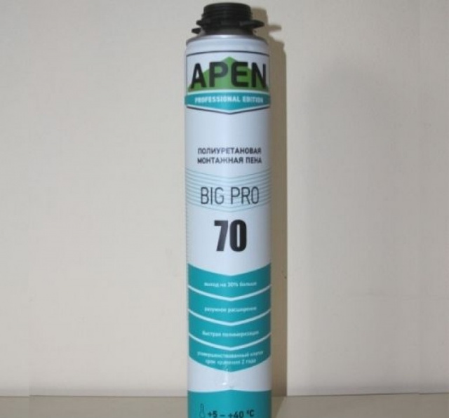 Пена Apen BIG PRO 70. Высококачественная полиуретановая пена с высоким выходом, разработаны для создания уплотнения между деталями конструкции и заполнение зазоров. Обеспечивает стабильность и пристосовуванисть нерухомости элементов.
